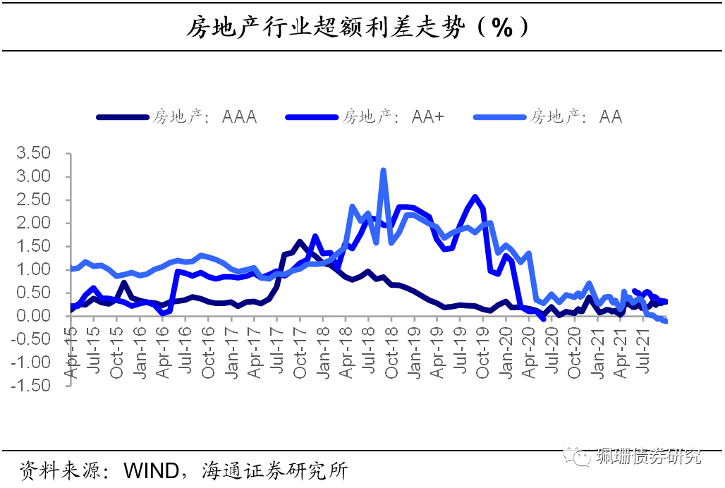 地产行业超额利差分化。具体来看,截至9月30日,AAA级地产行业超额信用利差为31BP,较8月末上行3BP;AA级地产行业超额信用利差为-11BP,较8月末下行5BP。