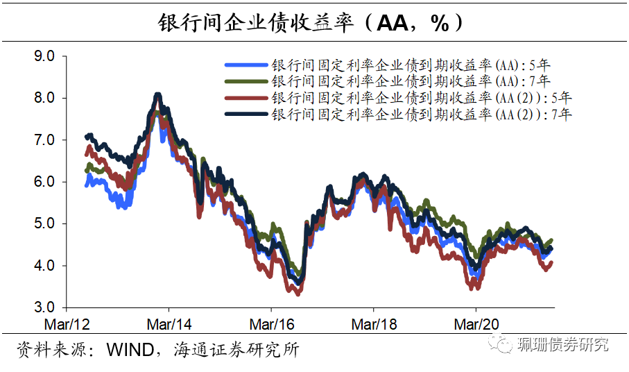 具体来看,1年期品种中,重点AAA、AAA等级收益率均上行7BP,AA+等级收益率上行5BP,AA等级收益率上行4BP,AA-等级收益率上行7BP。3年期品种中,重点AAA、AAA等级收益率均上行3BP,AA+等级收益率上行5BP,AA等级收益率上行1BP,AA-等级收益率上行5BP;5年期品种中,重点AAA等级收益率上行4BP,AAA等级收益率上行2BP,AA+等级收益率上行4BP,AA等级收益率上行2BP,AA-等级收益率上行8BP。