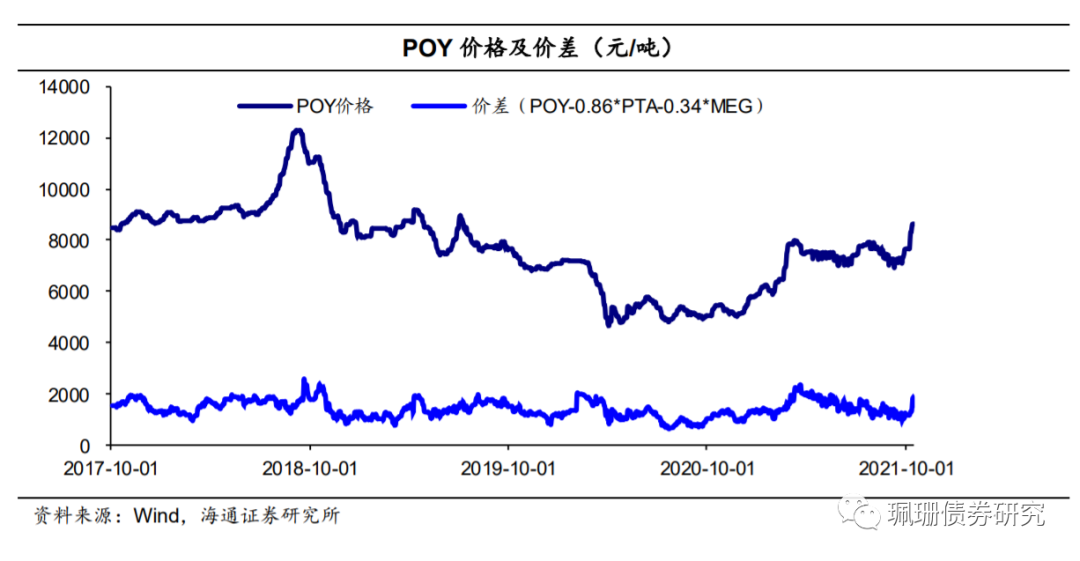 涤纶长丝POY价差大幅走阔。截至10月15日,华东地区涤纶长丝POY价格为8625元/吨,价差为1526.3元/吨,周环比分别上涨625元/吨、走阔303.9元/吨。