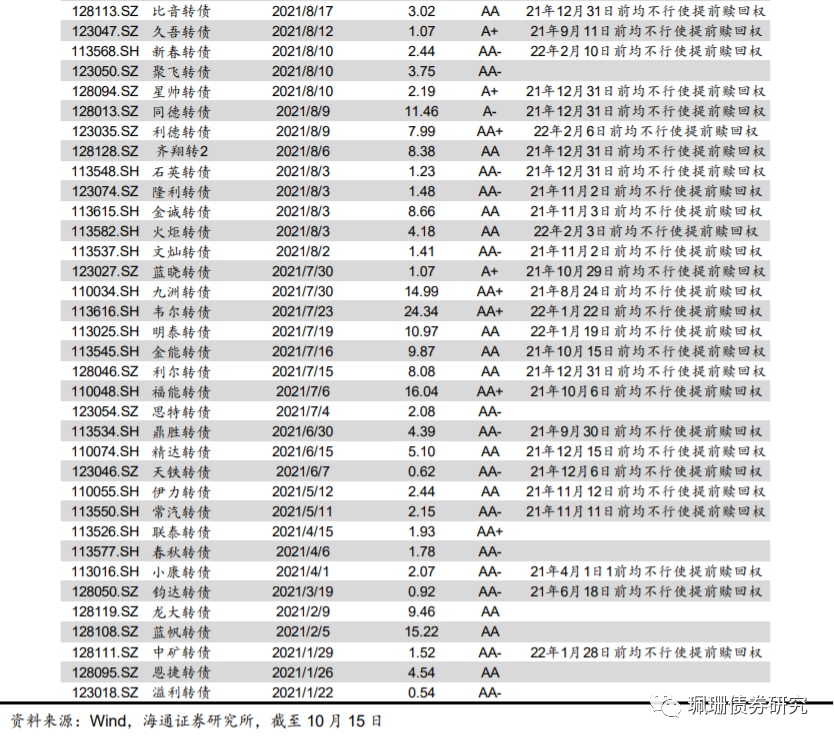 审批方面,盘龙药业(2.76亿)、仙鹤股份(20.5亿)、宏发股份(20.00亿)、山东玻纤(6.00亿)转债获批文;华兴源创(8亿)、博瑞医药(4.65亿)转债过会;重庆银行(130亿)、裕兴股份(6亿)转债获受理。另外,永冠新材(7.7亿)、恒锋信息(2.49亿)、松霖科技(6.1亿)、益生股份(10.4亿)、新致软件(5.1亿)公布了转债预案。(以上包括10月8日公告)截至2021年10月15日,待发新券共3994.50亿元,共186只(待发转债详见附表2)。其中批文+过会的转债405.13亿元,共40只。![]()