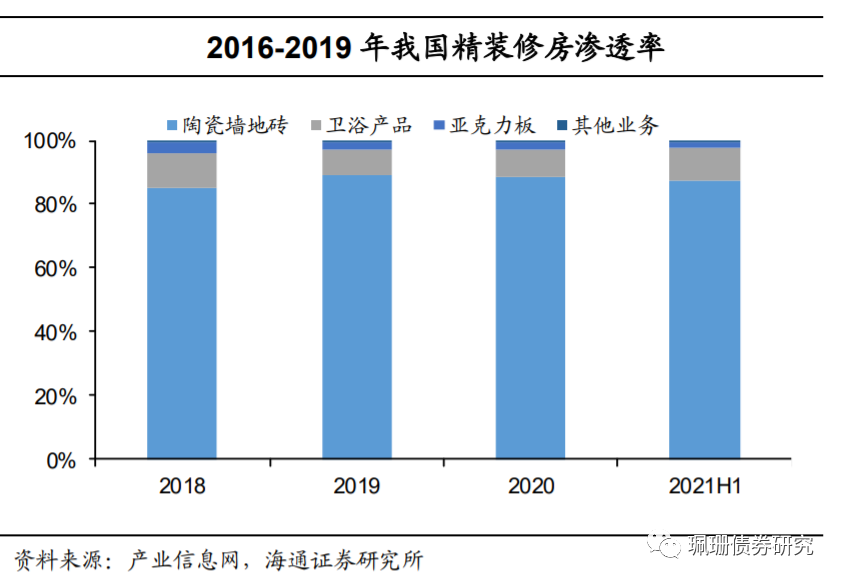地产竣工回升,瓷砖需求有望改善。根据海通证券研究所建材组的测算,2018年新建住宅的瓷砖消费量占瓷砖整体消费量的47.52%,是瓷砖最大需求领域,因此瓷砖需求与房屋竣工关系密切。从19年8月开始,单月竣工增速开始转正。20年受到新冠疫情影响,全年开工增速和竣工增速均负增长,近期竣工面积有所回升,有望稳定瓷砖需求。9月底人民银行、银保监会联合召开房地产金融工作座谈会,指导金融机构“围绕‘稳地价、稳房价、稳预期’目标,准确把握和执行好房地产金融审慎管理制度”,强调“促进房地产市场平稳健康发展”,结合刘鹤副总理在2021年金融街论坛年会开幕式上的书面致辞表示“目前房地产市场出现了个别问题,但风险总体可控,合理的资金需求正在得到满足,房地产市场健康发展的整体态势不会改变”,房地产融资或边际改善。精装修比例逐步提升,仍有较大空间。2017年4月,住房和城乡建设部印发《建筑业发展“十三五”规划》,要求到2020年新开工全装修成品住宅面积达到30%。19年2月下旬,住建部发布《住宅项目规范(征求意见稿)》,明确提出“城镇新建住房全装修交付”。未来新房精装修交付占比将持续提升。根据中国产业信息网数据,我国精装修商品住宅渗透率从2016年的12%提升至2019年的32.8%,但相比于北美(80%)、欧洲(86%)、日本(84%)等成熟市场的渗透率仍有明显提升空间。随着政策的推行及市场的导向,腰部房企新建住宅的精装率近年在迅速提升,从销售端到竣工端有两年左右的滞后,所以未来除了前三大房企外,还会集中体现在腰部的房企中。![]()
