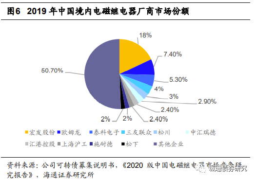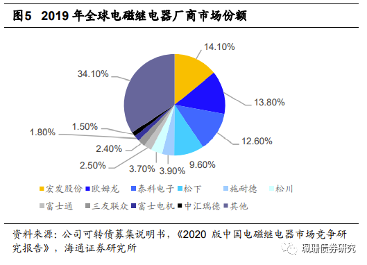 宏发股份是全球继电器行业的龙头企业,20年控股子公司宏发电声全球电磁继电器市场占有率为 14.10%,排名全球第一。公司主要产品为继电器产品和电气产品,下游应用领域广阔,涵盖家用电器、智能家居、智能电网、新能源、建筑配电、汽车工业、轨道交通、工业控制、安防、消防等领域。