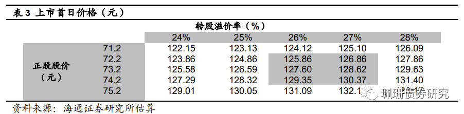 当前正股价对应宏发转债上市价或在125-129元左右。定价方面,参考平价相近的转债,我们预计宏发转债上市首日的溢价率将在24%-28%左右。若上市后宏发股份股价在71.2-75.2元之间,对应可转债价格中枢或在125-129元左右。
