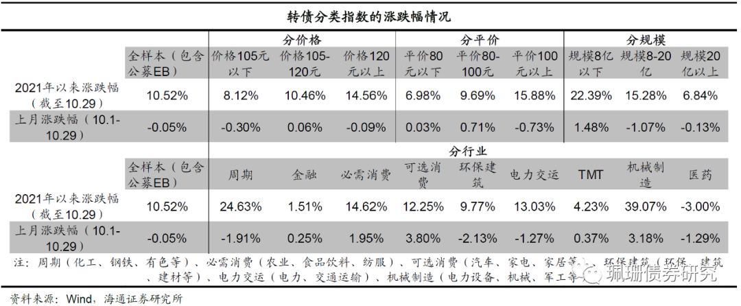 转债指数上涨。10月中证转债指数上涨0.12%,10月日均成交量(包含EB)716.25亿元,环比下降17.21%,我们计算的转债全样本指数(包含公募EB)下跌0.05%。同期沪深300指数上涨0.87%、创业板指数上涨3.27%、上证50上涨2.20%、国证2000下跌0.75%。