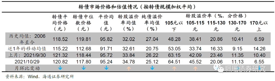转债市场溢价率高位震荡。截至10月29日,全市场的转股溢价率均值为34.78%,较9月末上升0.94%;纯债溢价率均值在25.12%,环比下降1.10%。