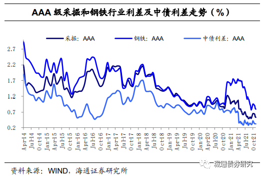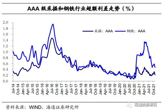 钢铁、采掘行业利差与超额利差均收窄。具体来看,截至11月5日,AAA级钢铁债信用利差平均为79BP,较前一交易周末下行3BP;AAA级采掘债(主要是煤炭开采)信用利差平均为54BP,较前一交易周末下行2BP;AAA级钢铁债超额利差为47BP,较前一交易周末下行2BP;AAA级采掘债超额利差为22BP,较前一交易周末下行1BP。