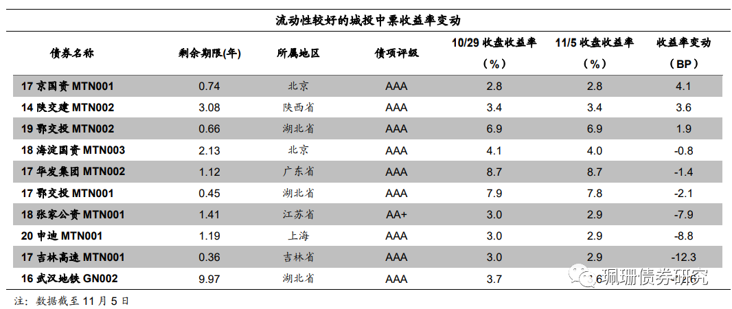 在我们观测的样本中,本周交易活跃的10只城投中期票据收益率下行为主。17京国资MTN001上行4.1BP,14陕交建MTN002上行3.6BP,19鄂交投MTN002上行1.9BP,18海淀国资MTN003下行0.8BP,17华发集团MTN002下行1.4BP,17鄂交投MTN001下行2.1BP,18张家公资MTN001下行7.9BP,20申迪MTN001下行8.8BP,17吉林高速MTN001下行12.3BP,16武汉地铁GN002下行12.6BP。
