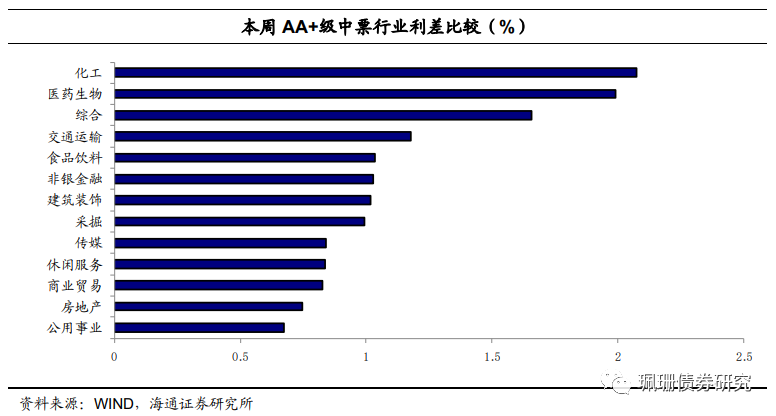 中等级债券中,化工利差最高,其次为医药生物、综合行业,其中AA+等级化工行业利差为210BP,医药生物行业利差则是落在195BP。而AA+等级综合行业利差则为163BP。最后,公用事业、房地产、商业贸易行业利差水平相对最低,分别为65BP、77BP、82BP,和化工行业信用利差均在120BP以上。