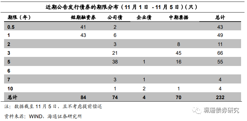 根据Wind统计,本周短融发行853.2亿元,到期736.8亿元,中票发行755.1亿元,到期757.8亿元;企业债发行52.0亿元,到期77.3亿元;公司债发行632.7亿元,到期397.0亿元。本周主要信用债品种共发行2293.0亿元,到期1968.8亿元,净供给324.20亿元,较前一个交易周(10月25日-10月29日)的622.88亿元有所减少。