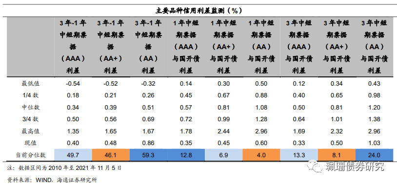 本周债市信用利差分化。具体来看,截至11月5日,3年期AAA等级中票信用利差为32BP,较前一交易周末下行1BP,5年期AAA等级中票信用利差为40BP,较前一交易周末上行1BP;3年期AA+等级中票信用利差为50BP,较前一交易周末下行1BP,5年期AA+等级中票信用利差为61BP,较前一交易周末上行1BP;3年期AA等级中票信用利差为108BP,较前一交易周末上行4BP,5年期AA等级中票信用利差为127BP,较前一交易周末上行3BP。