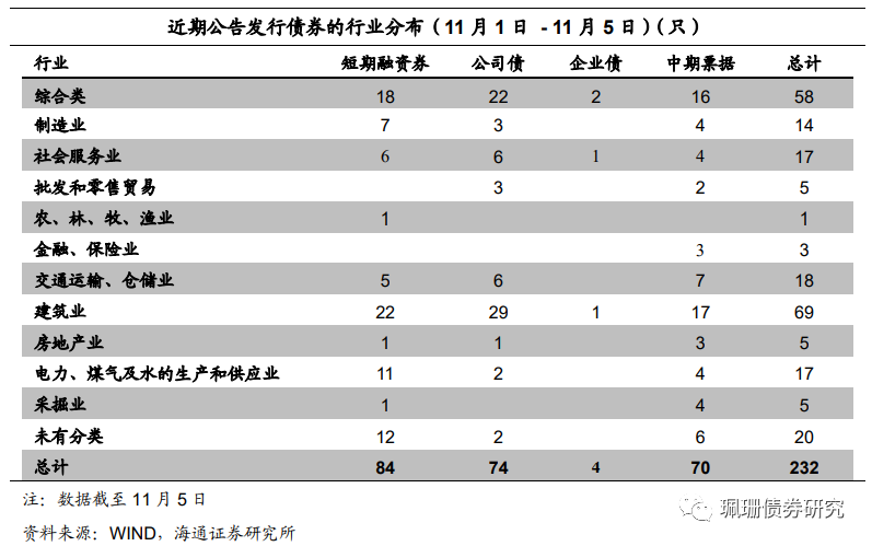 从主要发行品种来看,本周共发行短融超短融84只,中期票据70只,公司债发行74只,企业债发行4只,发行数量较前一个交易周减少。从发行人资质来看,AAA等级发行人占比最大为53.02%。从行业来看,建筑业行业发行人占比最大为29.74%,其次为综合类行业发行人,占比为25.00%。在发行的232只主要品种信用债中有57只城投债,占比约24.57%,发行数量比前一周有所减少。