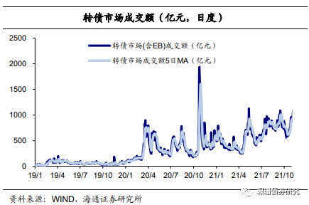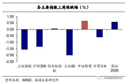 上周中证转债指数上涨0.65%,周日均成交量(包含EB)961.1亿元,环比上涨8.02%,我们计算的转债全样本指数(包含公募EB)上涨0.55%。同期沪深300指数下跌-1.35%、创业板指数上涨0.06%、上证50下跌2.01%、国证2000上涨0.58%。