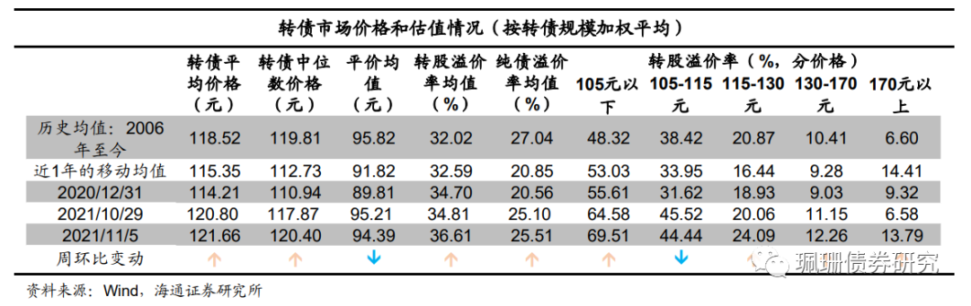 全市场转股溢价率、纯债溢价率上涨。截至11月5日,全市场的转股溢价率均值36.61%,环比上涨1.80个百分点;纯债溢价率均值25.51%,环比上涨0.41个百分点。其中价格105元以下、105-115元、115-130元、130-170元、170元以上转债的转股溢价率分别为69.51%、44.44%、24.09%、12.26%、13.79%,较上周分别+4.93、-1.08、+4.03、+1.11、+7.21个百分点。