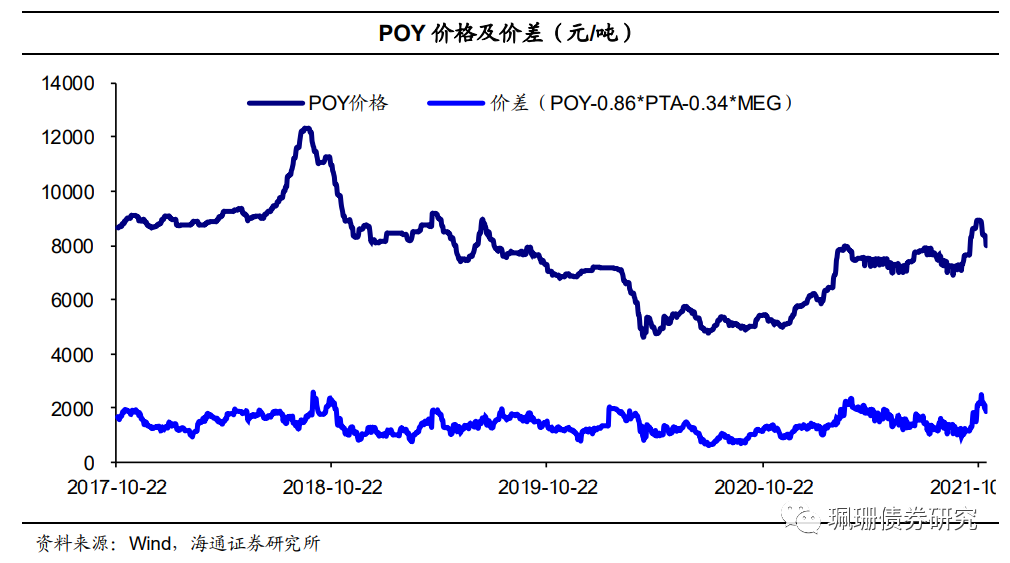 涤纶长丝POY价差收窄。截至11月05日,华东地区涤纶长丝POY价格为8000元/吨,价差为1964元/吨,周环比分别下跌350元/吨、收窄229元/吨。