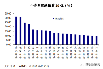 个券表现,涨多跌少。个券281涨1平101跌。个券涨幅前5位分别是清水转债(31.62%)、模塑转债(31.41%)、中天转债(24.58%)、钧达转债(22.81%)和艾华转债(16.77%)。跌幅前5位分别是金诺转债(-16.42%)、19新钢EB(-15.13%)、嘉元转债(-14.14%)、盛虹转债(-14.06%)、金诚转债(-14.03%)。