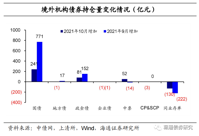 10月境外机构继续增持,但增幅大幅减小615亿元,其中主要增持国债和政金债,主要减持存单。外资行由9月的增持存单17亿元转为减持存单39亿元,中票、短融超短融也均为减持。![]()