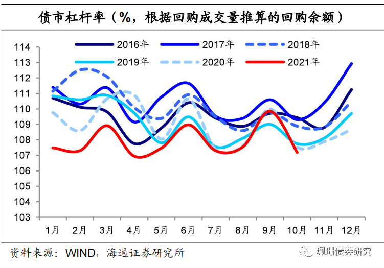 21年10月银行间债市杠杆率为107.2%(中债登口径的待回购余额数据自3月起停止披露,因此我们调整为依据质押式回购余额来测算回购余额,再进一步测算银行间债市杠杆率,自此债市杠杆率数据与21年3月之前报告中债杠杆率口径不一致),环比下降2.7个百分点,同比下降0.3个百分点,处于14年以来同期历史低位。![]()