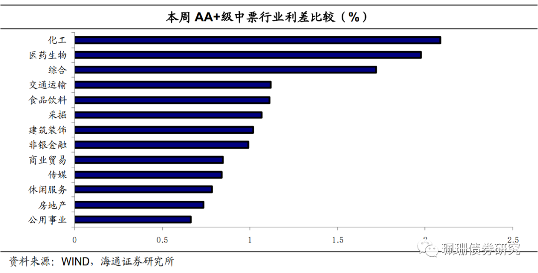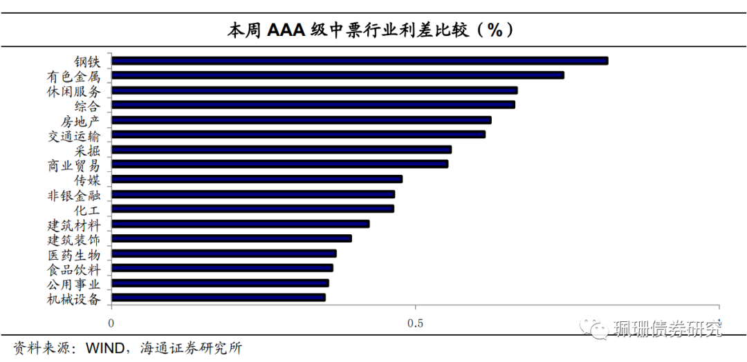 高等级债中,钢铁、有色金属是利差最高的两个行业。AAA级钢铁行业中票平均利差为82BP,AAA级有色金属行业中票平均利差为74BP。其次是休闲服务、综合、房地产,其利差分别为67BP、66BP和62BP。机械设备是平均利差最低的行业,目前为35BP。