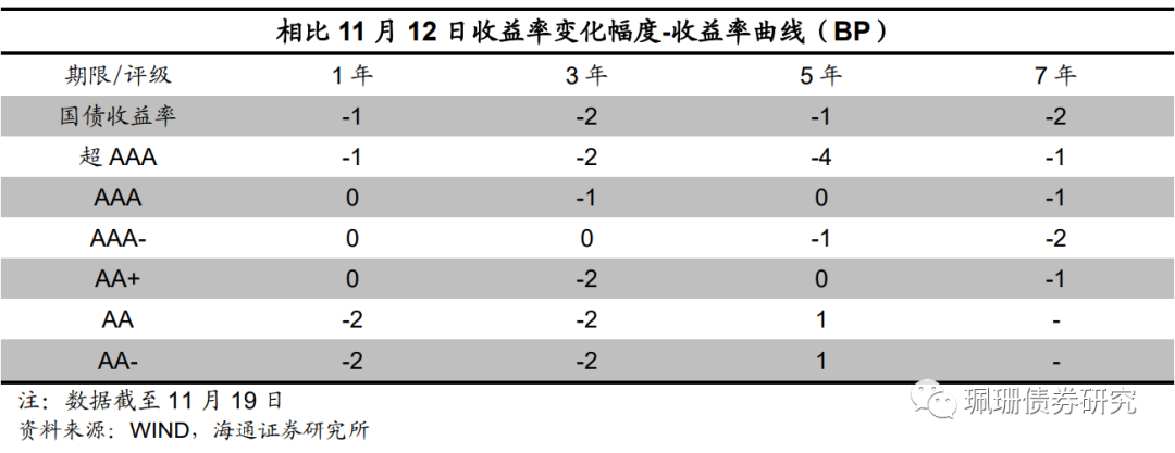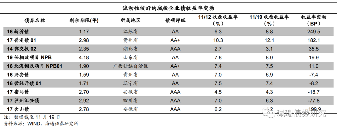 城投债利差整体走扩。具体来看,截至11月19日,城投债AAA级利差为83BP,较前一交易周末上行5BP;城投债AA+级利差为111BP,较前一交易周末上行4BP;城投债AA级利差为190BP,较前一交易周末上行4BP。