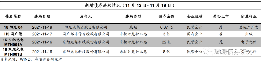 本周新增违约债券4只,为18阳光04、H5国广债、16东旭光电MTN001A、16东旭光电MTN001B。具体来看: