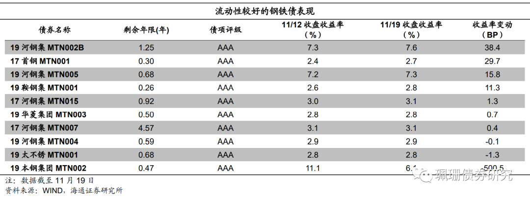 本周我们观测的钢铁债样本中,代表性债券的收益率上行为主。具体来看,19河钢集MTN002B上行38.4BP,17首钢MTN001上行29.7BP,19河钢集MTN005上行15.8BP,19鞍钢集MTN001上行11.3BP,17河钢集MTN015上行1.3BP,19华菱集团MTN003上行0.7BP,17河钢集MTN007上行0.4BP,19河钢集MTN004下行0.1BP,19太不锈MTN001下行1.3BP,19本钢集团MTN002下行500.5BP。