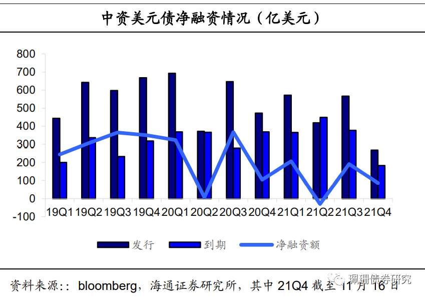 中资美元债一级融资情况来看,二季度收缩,三季度回暖。2020年上半年受疫情冲击,美元流动性紧张,中资美元债融资额在第二季度创下新低;下半年伴随美元流动性恢复,中资美元债融资额回归正常。今年二季度净融资有明显的缺口,主要受新冠疫情反复、经济数据表现不佳以及信用事件频发等因素影响,中资美元债净融资额大跌,6月以来有所缓和,净融资回暖。