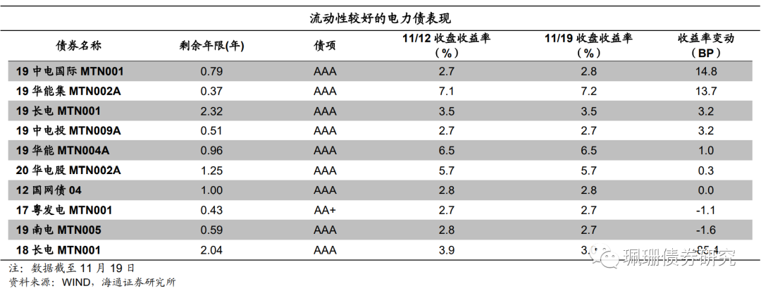 本周我们观测的电力债样本中,代表性债券的收益率上行为主。具体来看,19中电国际MTN001上行14.8BP,19华能集MTN002A上行13.7BP,19长电MTN001上行3.2BP,19中电投MTN009A上行3.2BP,19华能MTN004A上行1BP,20华电股MTN002A上行0.3BP,12国网债04与上周保持一致,17粤发电MTN001下行1.1BP,19南电MTN005下行1.6BP,18长电MTN001下行85.4BP。