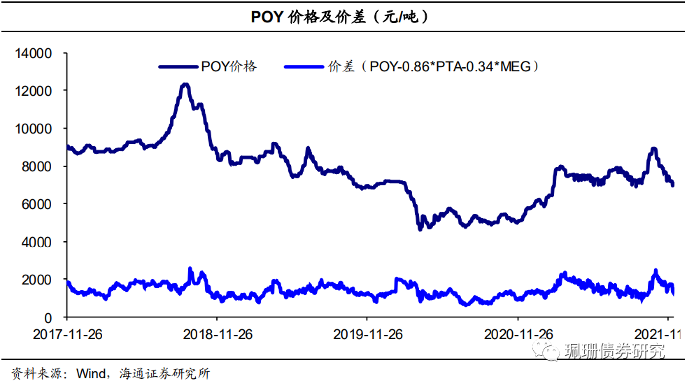 涤纶长丝POY价差收窄。截至12月10日,华东地区涤纶长丝POY价格为7075元/吨,价差为1468.10元/吨,周环比分别下跌125元/吨、收窄265.4元/吨。