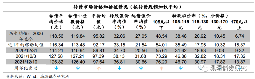 全市场转股溢价率均值、纯债溢价率均值下跌。截至12月11日,全市场的转股溢价率均值36.81%,环比下跌1.32个百分点;纯债溢价率均值30.66%,环比下跌1.02个百分点。其中价格105元以下、105-115元、115-130元、130-170元、170元以上转债的转股溢价率分别为76.20%、46.70%、30.97%、17.82%、13.87%,较前一周分别+2.91、-0.18、-1.85、-0.49、-3.45个百分点。