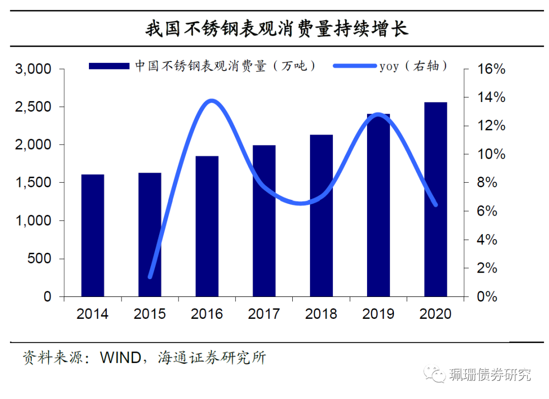 下游需求量持续增长,行业分布较为均匀。从不锈钢需求端来看,根据WIND和中国特钢企业协会不锈钢分会数据显示,中国不锈钢需求规模总量较大,表观消费量持续增长,2020年达到2561万吨,同比+6.46%。同时,不锈钢下游行业结构分布较为均匀。![]()