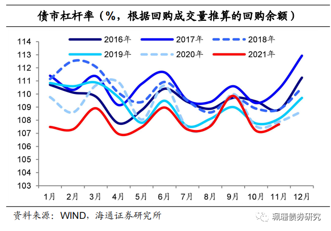 21年11月银行间债市杠杆率为107.7%(中债登口径的待回购余额数据自3月起停止披露,因此我们调整为依据质押式回购余额来测算回购余额,再进一步测算银行间债市杠杆率,自此债市杠杆率数据与21年3月之前报告中债杠杆率口径不一致),环比上升0.5个百分点,同比下降0.2个百分点。![]()