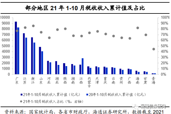 2021年政府财力方面,从一般公共预算收入情况来看,20年受疫情因素叠加影响,部分地区一般公共预算收入同比增速为负,21年1-10月同比增速普遍转正(黑龙江除外),需关注黑龙江、重庆、宁夏等19-20年同增持续为负的地区以及广西、云南等同增较为缓慢的地区;从税收收入来看,需关注税收收入较去年同期减少的江西以及税收收入占比较低的青海。