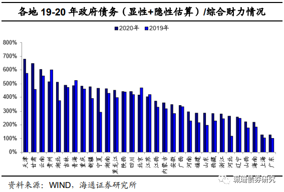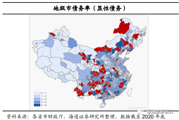细化到各地级市债务情况,我们分别测算了2020年300+地级市显性债务率和包括隐性债务的总债务率。采用地级市债务率(显性债务)=政府债务余额/一般公共预算收入,地级市债务率(显性+隐性债务)=(政府债务余额+城投有息债务)/一般公共预算收入,部分地区显性债务率超过100%,除西南地区外,财政实力偏弱的内蒙古、贵州、东北三省的部分地区债务率较高,江苏部分地区的总债务率也偏高。