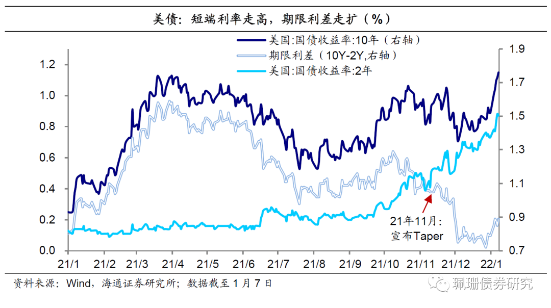 为何美债飙升?加息缩表预期大幅提前推升实际利率。上周十年期美债利率大幅上行24BP至1.76%、创2020年2月以来新高。利率上行主因实际利率大幅上行32BP至-0.72%、创2021年5月以来新高,而通胀预期反而下行8BP。从期限结构角度看,2年期美债上行,10Y-2Y期限利差走阔。薪资上涨和失业率持续改善显示就业市场强劲。12月美联储会议纪要释放鹰派信号,加息与缩表预期纷纷提前,截至1月7日市场预期3月加息概率接近90%。政策以我为主。我国经济面临需求收缩、供给冲击、预期转弱三重压力,虽然近期经济环比改善但上半年同比下行压力仍较大,需要货币政策保持流动性合理充裕,从实体回报率和贷款利率关系、货币财政政策协调联动、银行息差角度来看,总量和结构性宽松政策仍可期(《宽松预期仍高2021年12月26 日》)。中美利差收窄,境外机构增持减弱,主要影响国债。境外机构已经占国债市场存量的11%,也是2021年国债二级市场的最大净买入机构。历史上当中美十年期国债利差在80BP或者利差大幅收窄时期外资国债增持量明显走弱。当前十年期中美国债利差106BP、仍处于较为舒适区间,若长端美债进一步走高导致中美利差收窄至80BP以下,需关注国债利率波动风险。我们在1月月报《政府债供给展望与利率新低的思考》对1月债市较为谨慎,认为“新低之后建议控制久期”。上周债市的确表现偏弱,走出了熊陡行情。展望未来一周,依然建议控制久期节奏,资金面平稳、机构杠杆不高的背景下采取短债杠杆套息策略,1月十年国债利率或在2.7%~2.9%区间波动,长债等待调整后的配置机会。基本面:需求仍弱、生产企稳,CPI或反弹、PPI或续降1月以来中观高频数据显示,钢材产量降幅收窄,沿海月均耗煤量同比增幅转正,行业开工率仍处于低位,30城商品房成交面积和百城土地成交面积同比降幅继续扩大,出口综合指数增速均放缓。物价方面,我们预计22年1月CPI或抬升,PPI或继续回落。