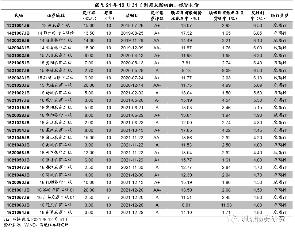 截至21年12月31日,所有已发行的二级资本债中,共有26只到期未赎回。从发行银行类型来看,有20只为农商行发行,6只为城商行发行;从债项评级分布来看,有5只评级为AA-,其余21只评级全部为AA-以下,到期未赎回债项评级普遍较低;从发行利率来看,到期未赎回的二级资本债中有7只债券选择支付6.00%以上的高利息;从债项赎回日前最新资本充足率来看,有3家未达到10.50%的资本充足率红线,分别为贵阳农商行、桐城农商行和辽东农商行,其余有6家不足12.00%,较监管红线空间不足;从债项赎回日前最新不良贷款率来看,有18家银行不良贷款率超过2.00%,不良率指标普遍较高,其中桐城农商行2019年末的不良贷款率达到9.09%,辽东农商行2021年半年末的不良贷款率达到11.93%。