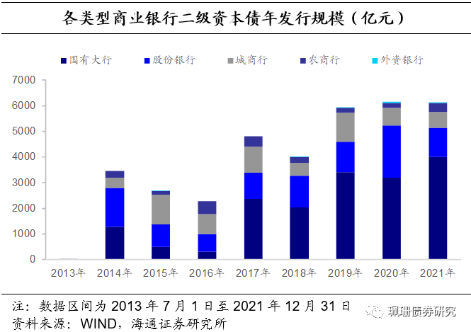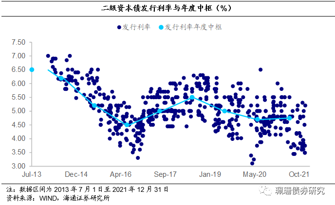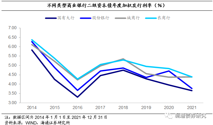 不同类型商业银行二级资本债发行利率分化。我们计算了2014年以来按发行规模进行加权的各类型商业银行二级资本债的年度加权发行利率,加权发行利率由高到低的类型排名大致为农商行>城商行>股份银行>国有大银行,截至21年12月31日,上述类型商业银行二级资本债年度加权发行利率分别为4.39%、4.39%、3.77%和3.65%,相比2020年,2021年各类型商业银行二级资本债加权发行利率表现为:国有大行下行31BP,股份银行下行94BP,城商行上行21BP,农商行下行45BP。