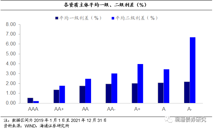 低资质主体普遍存在一二级利率倒挂现象。我们以2019-2021年在二级市场上交易的二级资本债作为样本,用发行利率-发行日同期限国开债利率计算样本债券的一级利差,用21年12月31日中债估值收益率-剩余期限对应的国开债收益率计算样本债券的二级利差。主体评级为AAA、AA+、AA、AA-、A+、A和A-级的二级资本债平均一级发行利差分别为0.55%、1.36%、1.75%、1.95%、2.01%、2.07%和2.18%,平均二级估值利差分别为0.20%、1.76%、2.49%、3.01%、3.96%、3.42%和6.70%,仅主体评级为AAA级的二级资本债一二级利差为正,其余主体资质较低的债券普遍存在一二级利率倒挂现象。