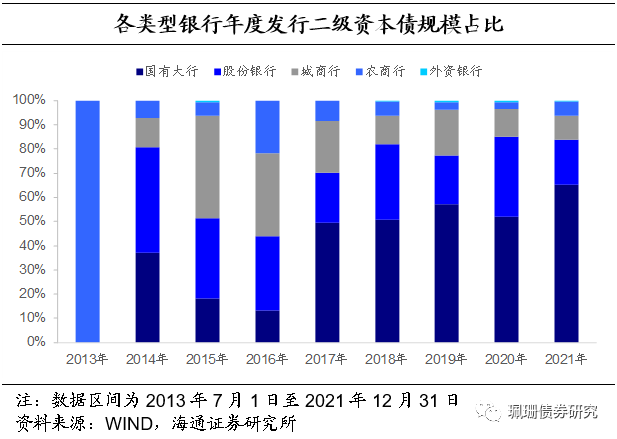 国有大行发行占主流,发行总规模占比约为48%。从规模上看,截至21年12月31日,国有商业银行、股份制商业银行、城商行、农商行及外资行的二级资本债发行规模分别达17080亿元、9721亿元、6287亿元、2277亿元和125亿元,其中国有大行发行总规模占半壁江山,占比约为48%。分年份来看,2018年以前,股份行及城商行发行规模占比较高;2018年至今,大行发行一直占主流,发行规模占比均在50%以上。