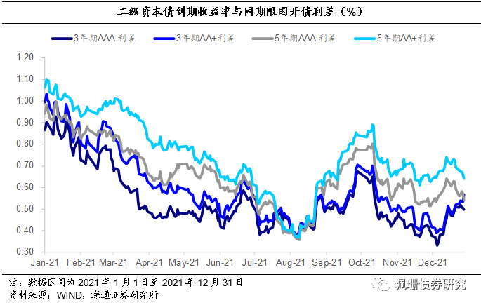 二级资本债信用利差分化,中高等级信用利差收窄,低等级信用利差走扩。由于二级资本债的发行期限以10年期为主,发行数量占比高达97%,因此我们选取不同债项评级的10年期二级资本债计算其到期收益率与同期限国开债收益率的利差。具体来看,截至21年12月31日,10年期AAA-、AA+、AA、AA-、A+和A级二级资本债与国开债的利差分别为57BP、67BP、99BP、197BP、313BP及451BP,相比20年12月31日,AAA-、AA+、AA和AA-级收益率分别下行46BP、51BP、77BP和37BP,A+和A级收益率分别上行13BP、83BP。