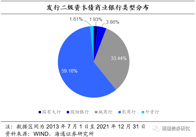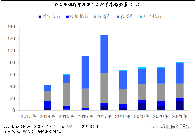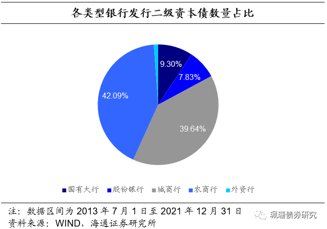 城商行、农商行发行活跃度较高,发行数量合计占比超80%。从发行数量来看,2013-2017年二级资本债总发行数量逐年增长,2018年缩减至2017年发行数量的一半,后保持平稳。截至21年12月31日,农商行、城商行分别发行258、243只二级资本债,合计占总发行数量的82%,尽管发行规模不及国有大行与股份银行,但活跃度较高。从发行银行类型来看,截至21年12月31日,共有311家商业银行发行了二级资本债,其中农商行184家、城商行104家,合计占发行银行总数的90%以上。