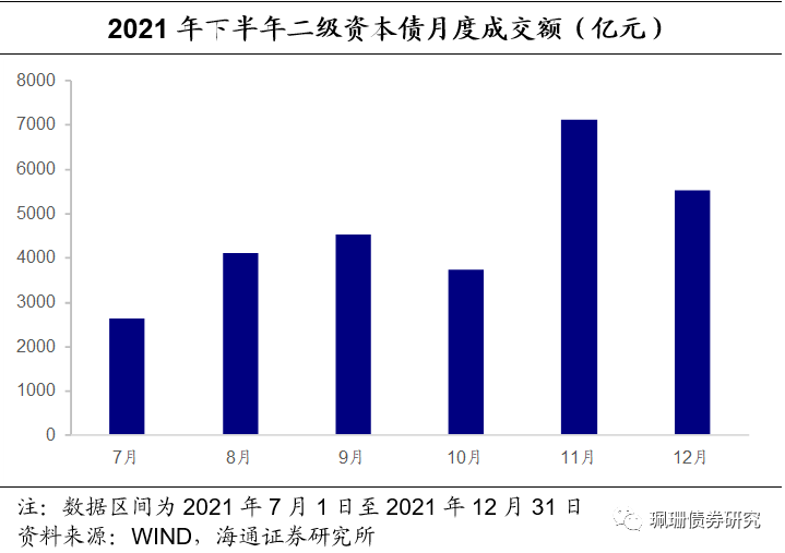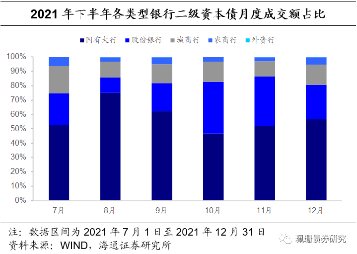 从2021年月度总成交额看,2021年下半年7-9月二级资本债成交额逐渐上升,10月成交额下降后,11月为下半年成交额最高峰,随后12月有所回落;从各类型银行二级资本债成交额占比来看,除10月之外其余各月国有大行的占比均超过50%,为成交最活跃的二级资本债类型,股份银行和城商行二级资本债成交相较农商行和外资行更活跃,2021年下半年各月,国有大行、股份银行和城商行合计成交额占比超二级资本债总成交额的90%。