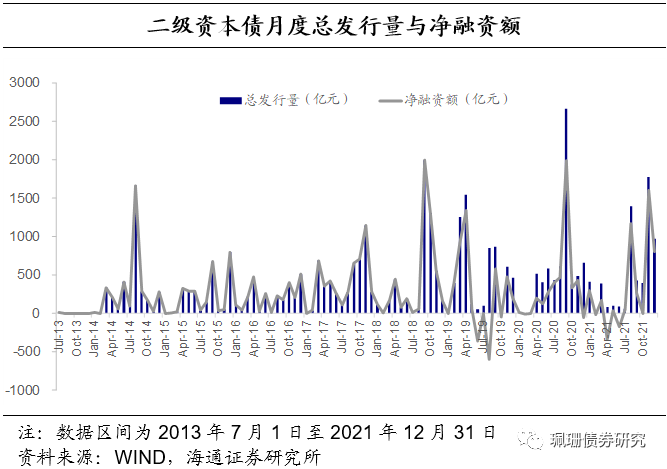 年度总发行规模略有回落。2021年商业银行二级资本债的年度发行规模达6171亿元,稍有回落。2013年《商业银行资本管理办法(试行)》对商业银行的核心一级资本充足率、一级资本充足利率和资本充足率均提出了最低要求,发行二级资本债是商业银行补充二级资本、提高资本充足率的有效方法。2013年第一只二级资本债发行以来共有三波发行高峰,分别是2014年、2017年和近两年。