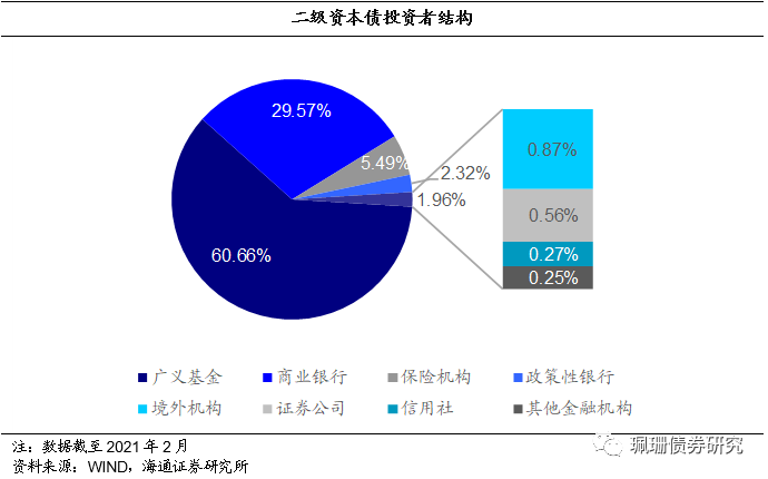 广义基金、商业银行为二级资本债的主要投资者。根据中债登数据,截至21年2月,持有二级资本债的投资者类型分为广义基金、商业银行、保险机构、政策性银行、境外机构、证券公司、信用社和其他金融机构。广义基金持有二级资本债14397.91亿元,占二级资本债总量的60.66%,其中商业银行理财产品持有5929.81亿元;商业银行持有二级资本债7019.95亿元,与广义基金共计持有超90%的二级资本债。