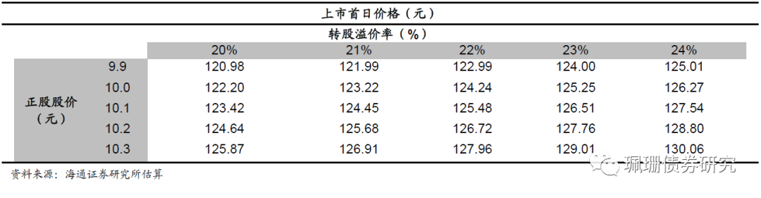 当前正股价对应绿动转债上市价格区间或在124-126元左右。定价方面,参考平价相近的转债,我们预计绿动转债上市首日的溢价率将在20%-24%左右。若上市后绿色动力股价在9.9-10.3元之间,对应可转债价格中枢或在125元左右。