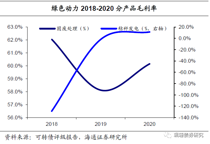 公司主营业务主要包括固废处理和秸秆发电两部分。固废处理为公司的主要收入来源,2020年实现营收21.55亿元,同比+32.05%,在总营收中占比94.6%;对应毛利率60.15%,较19年同比+2.02pcts。该业务板块主要运营模式为通过与各地政府合作,通过BOT模式建设和运营垃圾焚烧项目并收取垃圾处理费,同时通过垃圾焚烧进行发电,向电网公司销售电力并获得售电收入;其产业链上游包括施工企业、安装企业、垃圾处理及发电设备供应商等,下游则为地方政府及电网公司。秸秆发电业务2020年实现营收1.23亿元,同比+1.78%,在总营收中占比5.4%;对应毛利率11.29%,较19年同比+13.37pcts。