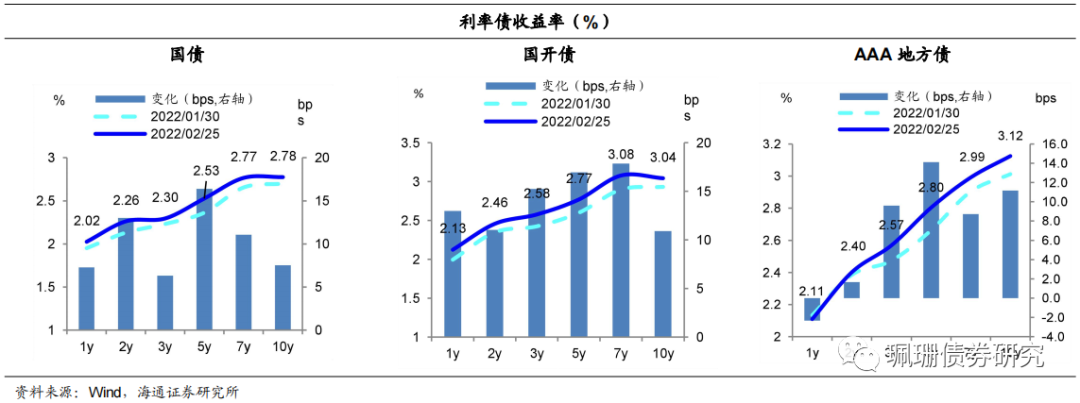 具体来看,2/1-2/25资金面先收敛后转松,R001/R007/DR001/DR007月均值环比+9BP/-9BP/+10BP/-2BP,3M SHIBOR与同业存单发行利率下行,国股银票1M\3M\1Y转贴现利率下行。利率债净供给环比减少2556亿元。1Y国债/国开债利率+7BP/+13BP至2.02%/2.13%,10Y国债/国开债利率+8BP/+11BP至2.78%/3.04%。