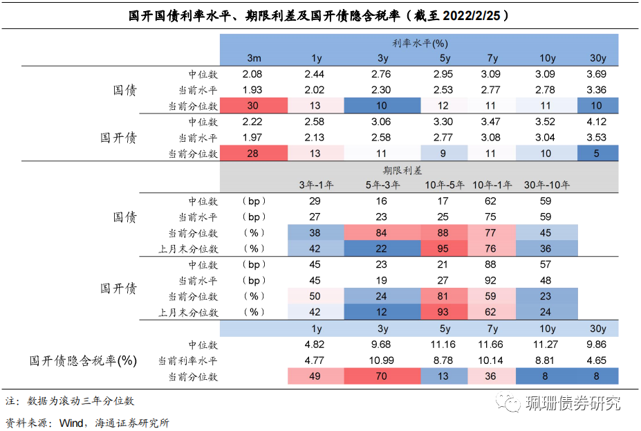 短债利率上行明显,各关键期限利率均上行但仍处偏低位,国开债收益率更低。截至2月25日,从收益率绝对水平来看,3M期限利率所处分位数由上月末的13%大幅上升至30%,其余关键期限利率也均有上行,处于10%-13%分位数区间内。其中,30Y利率所处分位数由上月末的2%上行至10%。相对于国债,国开债利率所处分位数整体更低,除3M期限位于28%分位数之外,其余关键期限均位于13%分位数及之下,其中30Y分位数由0%上升至5%。
