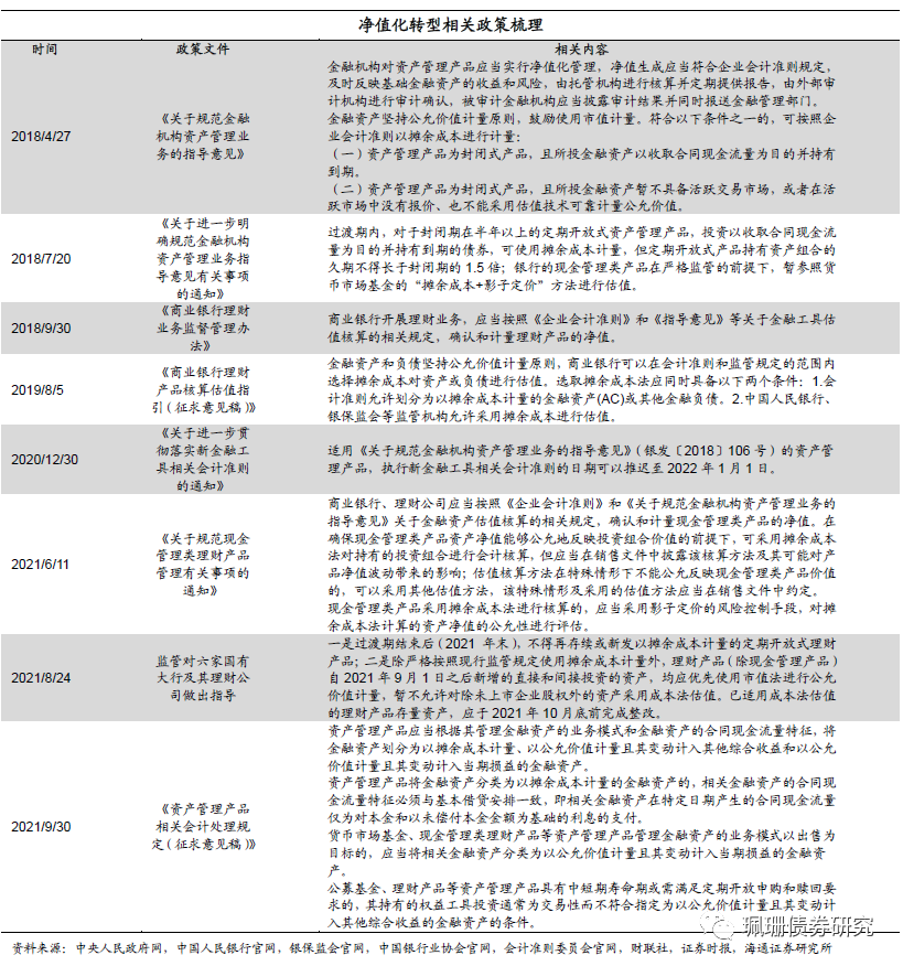 2018年4月27日,人民银行、银保监会、证监会、外汇局联合发布《关于规范金融机构资产管理业务的指导意见》(简称《资管新规》),要求对资产管理产品应当实行净值化管理,金融资产坚持公允价值计量原则,鼓励使用市值计量,拉开理财净值化转型的序幕。自此,监管机构陆续出台《商业银行理财业务监督管理办法》(简称《理财新规》)、《商业银行理财产品核算估值指引(征求意见稿)》(简称《估值指引》)等一系列补充及配套文件,进一步细化并落实《资管新规》,推进理财净值化转型、减少摊余成本计量。随着《资管新规》过渡期正式结束,理财净值化转型平稳收官。