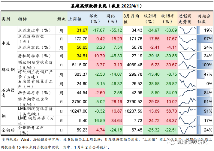 3月基建高频环比表现偏弱。从3月以来的基建高频数据表现来看,上周生产类指标普遍走低,螺纹钢主要钢厂产量、石油沥青装置开工率表现较差,环比下降且3月均值不及21年和19年同期水平;全钢胎开工率表现一般,虽环比有所改善但3月均值仍不及21年和19年同期水平。价格类指标,如水泥价格指数、螺纹钢/沥青期货收盘价、LME铜现货结算价月均值同比上涨,并处于历史同期高位。库存类指标表现分化, LME铜库存环比增加,但3月均值不及21年和19年同期水平;沥青库存率虽环比下降,但其3月均值超过21年和19年同期水平。整体来看,3月国内疫情形势较为严峻,基建生产节奏放缓,但考虑到政策更加强调稳增长、国常会表态开工一批水利工程等因素,我们预计4月基建高频数据表现会有所改善。