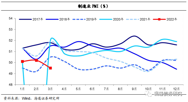 3月制造业PMI走弱。受国内多地疫情散发,国际地缘政治冲突影响,3月制造业PMI下行0.7个百分点至49.5%、回落至荣枯线下方,创17年以来历史同期新低,结束了此前连续四个月扩张的趋势,其中产需两端均偏弱,生产端PMI连续四个月放缓、已处于萎缩区间,需求端PMI则大幅回落1.9个百分点至48.8%,新出口订单指数也创去年11月以来新低。总体来看,我国内外需均走弱。
